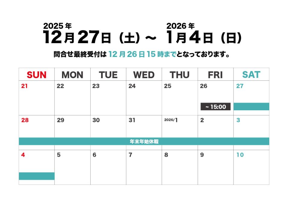 【年末年始休業期間】2025年12月27日(土)〜2026年1月4日(日)
